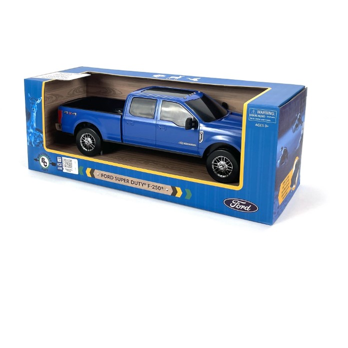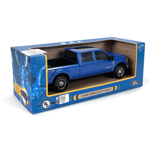 Our 1:20 scale, replica Ford Super Duty F-250 comes complete with a gooseneck connector and bumper hitch to fit with our full line of farm, ranch, and adventure trailers. The back tailgate can fold down just like a real truck. This Ford truck is the perfect addition to Big Country Toys playset!