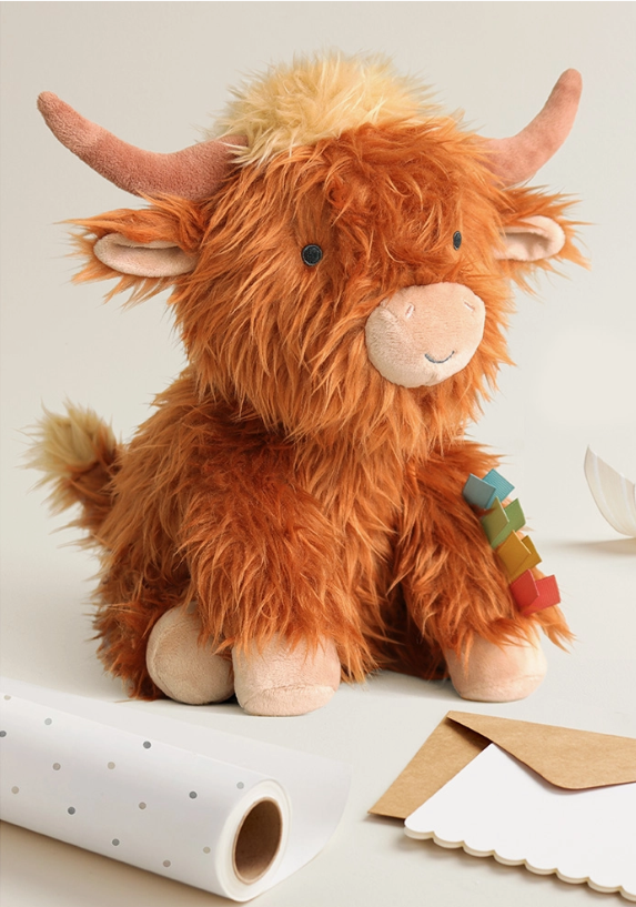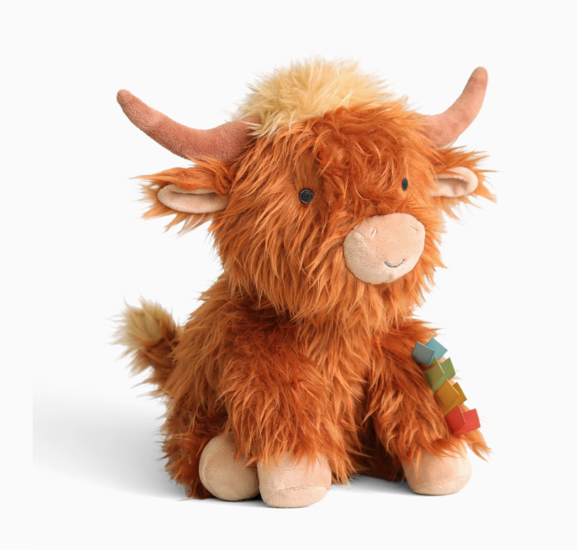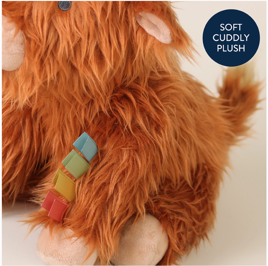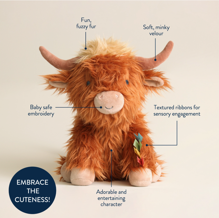 Our iconic Wyatt the Highland Cow brought to life in a soft, cuddly plush. Features multiple soft fabric textures and ribbons for sensory exploration and promotes self-soothing.